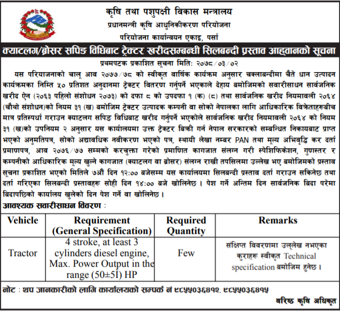 क्याटलग सपिङ्ग विधिबाट ट्रैक्टर खरिदका लागि सिलबन्दी प्रस्ताव आह्वान सम्बन्धि सूचना